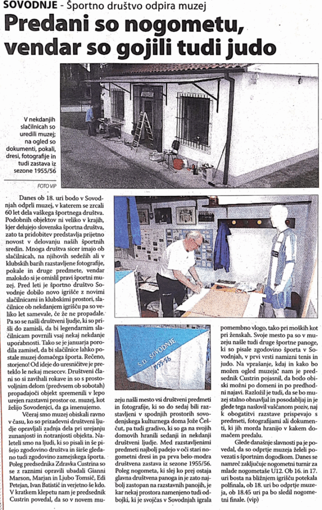 Po pridobitvi novega nogometnega igrišča leta 2011, je društvo zapustilo zgodovinski »kampo« na prvomajski ulici. Stavba, kjer so bile stare garderobe (slačilnice) je nekaj let samevala in po zaključku gradbenih del za širitev avtoceste so se nekateri starejši odborniki odločili, da v teh prostorih postavijo društveni muzej. Posodobili in obnovili so eksponate, ki so jih pripravili za razstavo ob 50. Letnici društva in pridobili še dodatno gradivo. Za preureditev prostorov so odborniki opravili več kot 800 ur udarniškega dela. Pomembno pridobitev so otvorili dne 13. maja 2015 ob prisotnosti velikega števila športnih ljubiteljev in uglednih gostov. Zgleda da je sovodenjski muzej edinstvem ne samo v zamejstvu ampak tudi v širšem slovenskem prostorov.